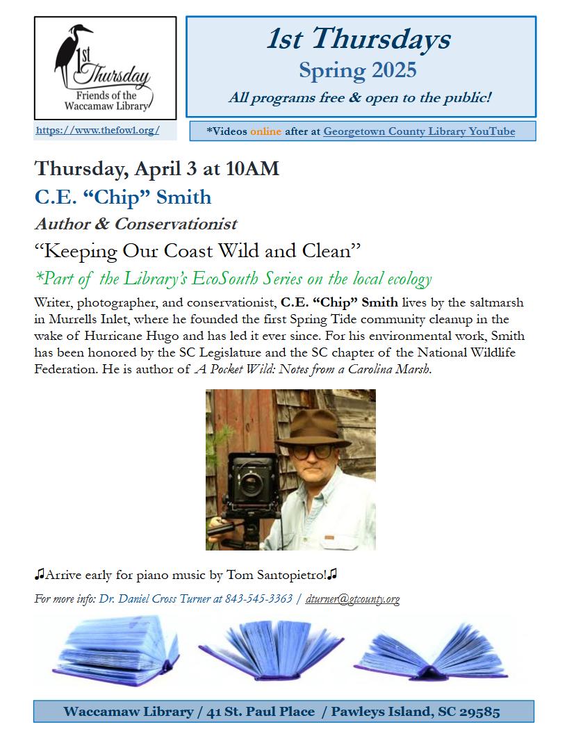 Come hear C.E. 'Chip" as he entertains us with stories about our beautiful Carolina Coast. His talk promises to be thought-provoking, challenging―and maybe even inspiring.
